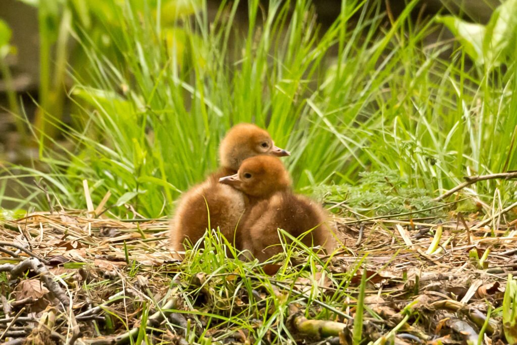 Damit markiert das Paar auch sein mehrere Hektar großes Brutrevier. Kraniche bevorzugen dafür waldige Seen-, Sumpf- und Moorlandschaften in Nord- und Osteuropa sowie in Nordasien. Der Brutplatz des Bodenbrüters liegt im Revierzentrum in feuchtem Gelände. In das Nest aus Schilf und Binsen legt das Weibchen seine meist zwei Eier. Eine Besonderheit ist die Geburtshilfe der Kraniche: Sobald die Jungen von innen an die Schale picken, treten die Eltern mit ihren Krallen vorsichtig nach dem betroffenen Ei, um dem Küken den Schlupf zu erleichtern. Die Küken sind Nestflüchter und schon nach 10 Wochen so groß wie ihre Eltern.
