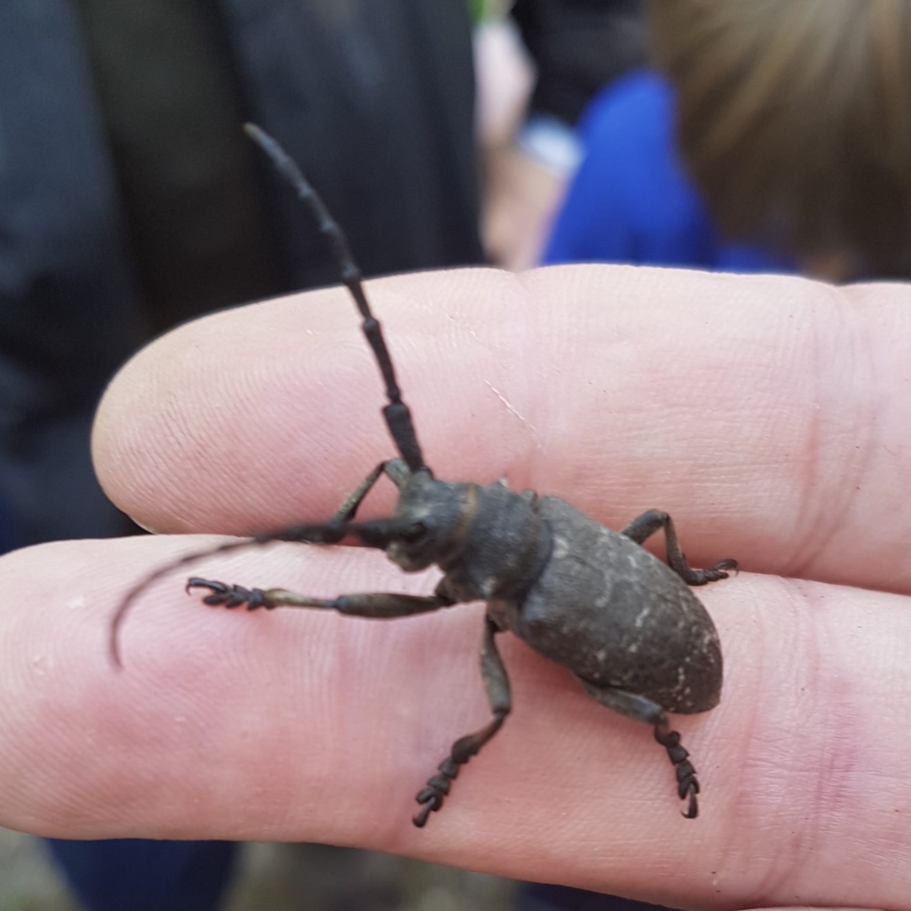 Zwei seltene Bockkäfer begegneten uns auf der Wanderung über den NABU-Rundweg am Freitagnachmittag:Auf der NABU-Fläche in der Reisersbach entdeckte Axel Wagner einen Großen Eichenbock, auch Heldbock genannt: Dieser in Deutschland vom Aussterben bedroht Bockkäfer zählt zu den größten Käfern Mitteleuropas und bevorzugt sonnenexponierte, kränkelnde oder absterbende Stieleichen, seltener Traubeneichen, Buchen oder Ulmen. In Deutschland ist er als nationale Verantwortungsart eingestuft. Kurz darauf im Fachinger Steinbruch fanden wir einen Weberbock (Bild): Dieser massige braunschwarze Bockkäfer lebt an alten Weiden und Pappeln. Bis etwa zur Wiedervereinigung galt er noch als häufig, ist aber seither stark zurückgegangen und steht heute fast überall als "stark gefährdet" auf den Roten Listen. Der auffallende Rückgang dieser Art wird auf fortgesetzte Flussregulierungen und das Verschwinden natürlicher Uferbepflanzung zurückgeführt.