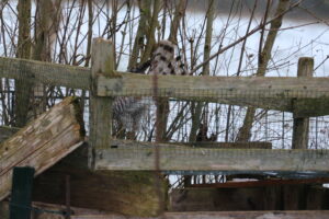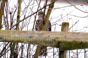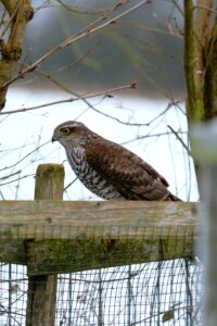 Kurze Zeit später setzte sich der Sperber auf die Umrandung unseres Komposthaufens und beobachtete eine Meise die sich im dichten Geäst eines Fliederbuschs aufhielt. Das Sperberweibchen versuchte die Meise zu schlagen, was aber misslang. Eine Zeitlang beobachte sie noch die Meise und flog schließlich fort.